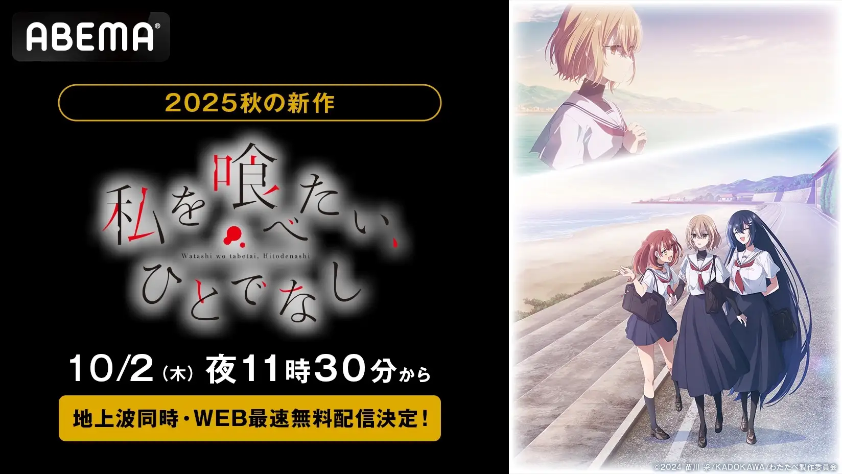 ABEMA will simulcast the new fall anime “Watashi o Tabetai, Hito de Nashi” every Thursday at 11:30 PM JST starting Oct 2, 2025. The latest episode is free for one week—grab the links below and catch it at the earliest legal timing. 🌊🖤