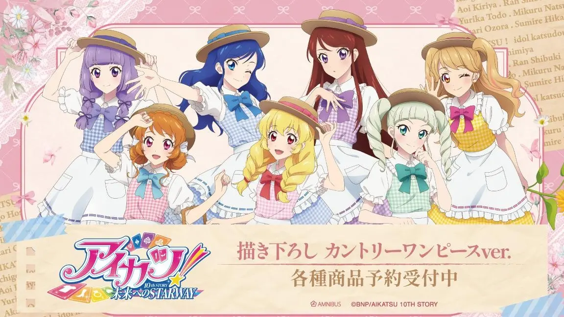 Aikatsu! 10th Story: Starway to the Future(アイカツ! 10th STORY ~未来へのSTARWAY~)is celebrating with a new wave of country dress–themed merch. AMNIBUS has opened pre-orders for ten items that pull Ichigo and the others into your daily routine, from trading acrylic stands to desk mats and tapestries – including options overseas fans can grab too.