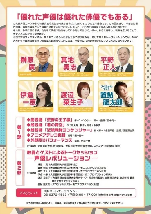 The festival is explicitly grounded in Aoni Production’s core idea that voice acting is a form of acting, not a shortcut around it. That is why the talk session in the second half brings together department head Hiroshi Sakakibara, professors and active voice actors Yūshi Maji, Masato Hirano, Kazue Ikura, and Naoko Watanabe—names tied to series like Nintama Rantarō, One Piece, Dragon Ball Super, and more—alongside special guest Ryōtarō Okiayu.